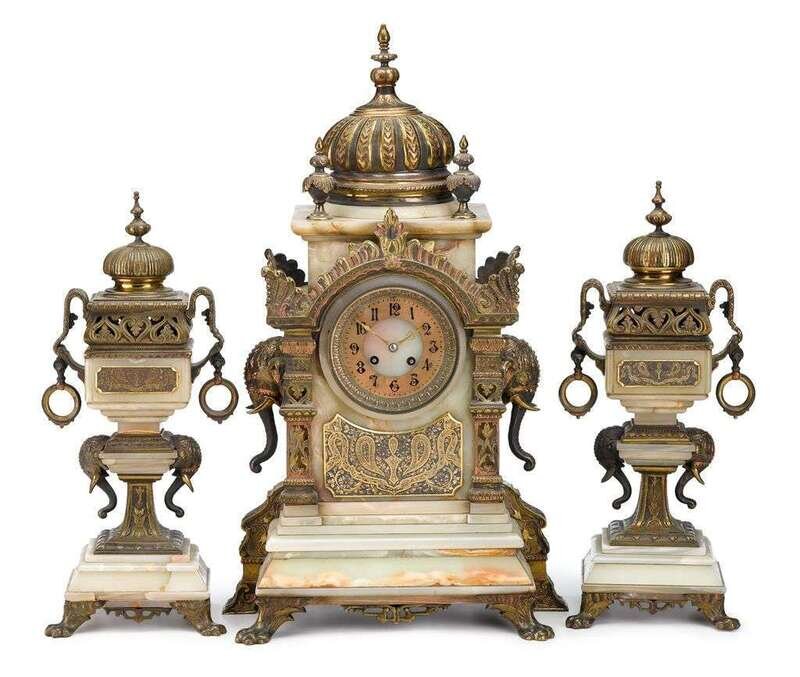 freres," france The circular dial with arabic numerals set within a mixed metal and variegated marble architectural case with an elephant head to each side and topped by two minarets flanking central onion dome topped with spire, the whole raised on paw feet, the two adjacent urns decorated en suite.