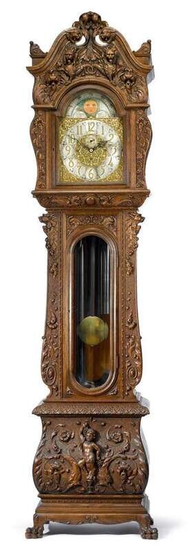 Works by John Elliott, London, heavily carved and shaped hood with scrolled cresting, gargoyles, leafage and lion heads enclosing brass moon phase dial, the shaped waist carved with griffins and foliage and fitted with an oval glazed door enclosing tubes, the bombe plinth carved with vines enclosing a satyr, all raised on a shaped base and hairy paw feet.