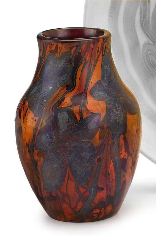 With stylized purple and blue flowers and branches against an orange and red ground, etched to underside, "L.C.T. E2100"