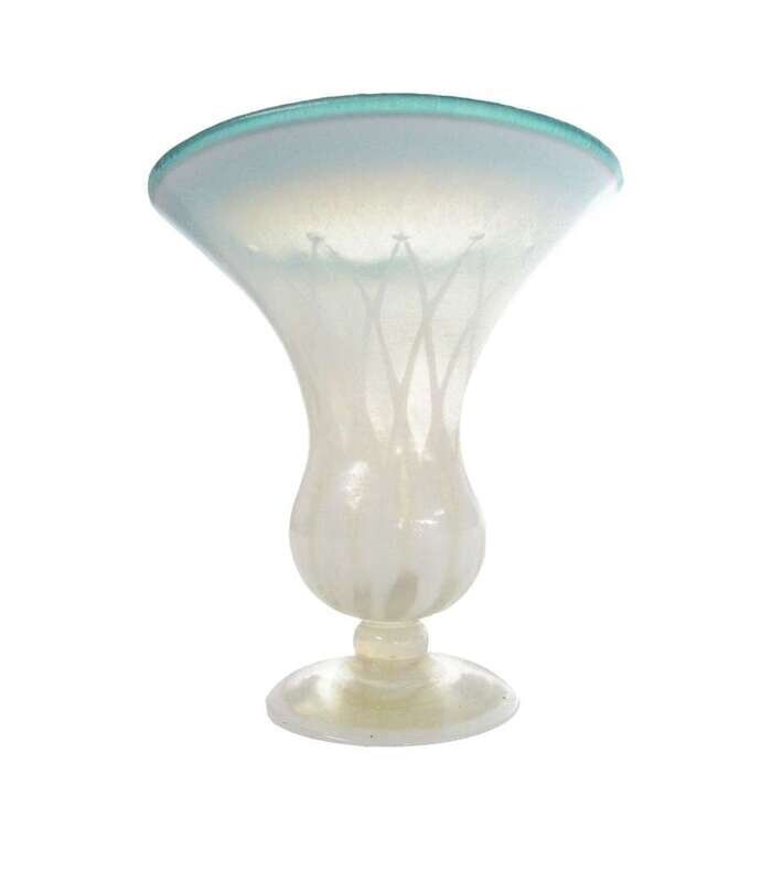 With green rim and opaque white pulled decoration, etched to underside, "1872 L.C.T. Favrile."