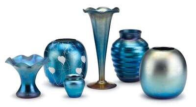 Six pieces blue iridescent art glass most durand, millville, nj, 20th century