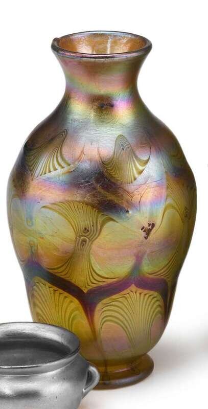 Having purple, green, and gold iridescent with all-over pulled design, etched to underside, "L.C.T. D291."