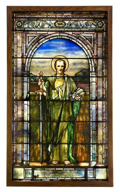 Signed lower right, "Tiffany Studios New York," depicting the standing figure of St. Paul holding sword and scrolls, with dedication panel along lower edge: "In Memory of Richard Smith Deacon of this Church 56 Years Born July 11 1811- Died March 4 1900 Loving Tribute By Friends To His Noble Christian Character...ht the Good Fight of Faith St. Paul 1 Timothy...," mounted in an illuminated wooden frame.