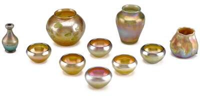 Comprising a set of six iridescent salts and four small vases: a bottle-form vase, signed, "L.C.T. B543"; a globular vase decorated with hearts and vines, signed "L.C.Tiffany Favrile"; a prunted vase, signed, "L.C.T. B1190"; and a vase with etched midband, numbered, "04101."