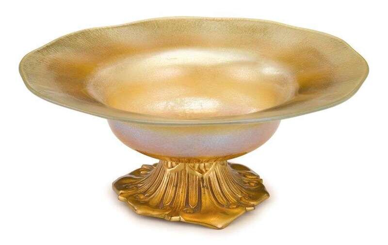 The gold favrile glass bowl with shaped rim mounted on gilt bronze base marked to underside, "Louis C. Tiffany Furnaces, Inc. Favrile 500."