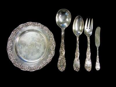 Comprising eleven dessert forks, ten flat-handled butter spreaders, three cream soup spoons, and one teaspoon; together with a small bread plate in the same pattern.