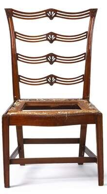 With a pierced slat back with carved anthemions above shaped seat and molded tapering square legs joined by stretchers.