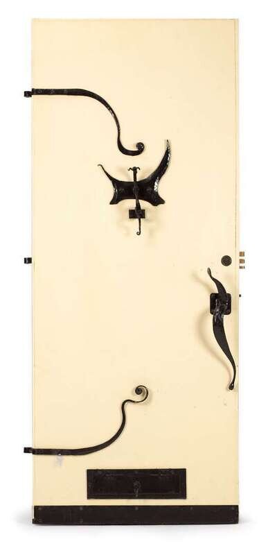 Comprising knocker, door handle, hinges, and mail slot, the knocker bears artist's signature and the date "'71," affixed to door.
