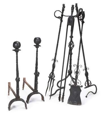 Set of sculptural wrought iron fire tools and andirons first third 20th century