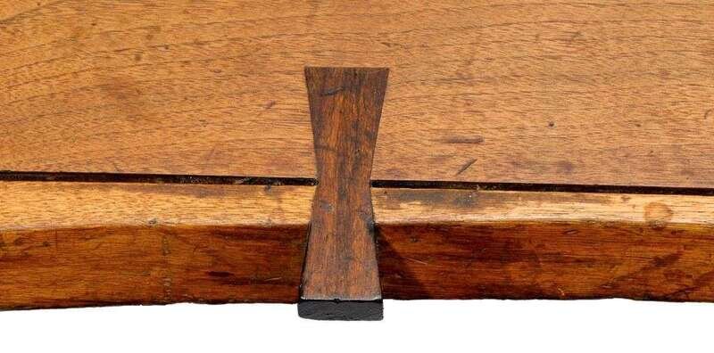 With free-form edge and three butterfly joins, one exposed and overhanging table's edge.