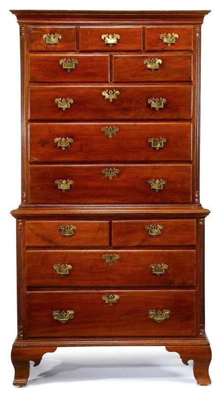 Upper section with molded cornice above arrangement of eight drawers, the lower section with arrangement of four drawers, flanked by fluted quarter columns on tall ogival bracket feet, all drawers lip-molded, inscribed, "Mary Miller 1806."