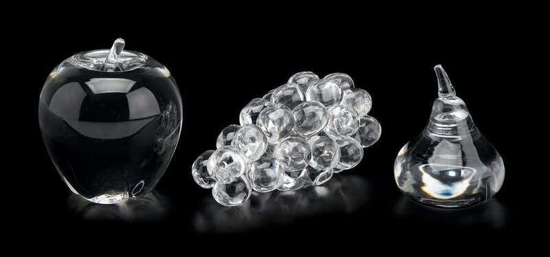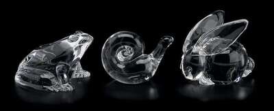 Including a boxed koala, designed by Lloyd Atkins; two rabbits; a seated cat; a flying goose; squirrel; apple; pear; grapes; and snail, each inscribed to underside, "Steuben"; together with a frog marked "Baccarat" and two seemingly unmarked swan form dishes.