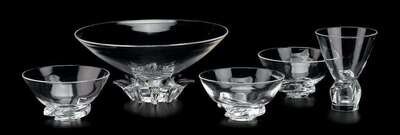 One large bowl and three matching smaller bowls; together with a conforming vase, all inscribed, "Steuben" to underside.
