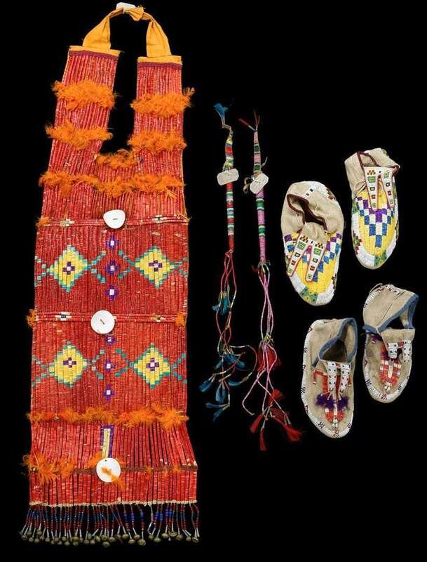 The breast plate worked with red, green, purple and yellow in stepped geometric design with orange dyed feathers and beaded bell fringe ornamented with shells; the moccasins with beaded bands and split tongues, quill-worked uppers; together with two quilled and beaded hair ornaments, each of cylindrical form with quilled, tin cone and dyed horse hair danglers.