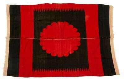 Comprised of two panels woven with a large red scalloped circle on black-brown ground.
