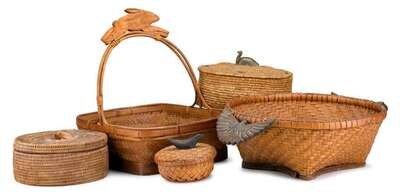 Including two oval covered baskets, with knops modeled as a flattened fish and loon, respectively; a square basket with loop handle wrapped with leaping rabbit; and a large open circular basket with shaped, square base and two applied spread-wing bird-shaped handles; together with a small covered basket with sitting bird knop from the Philippines.