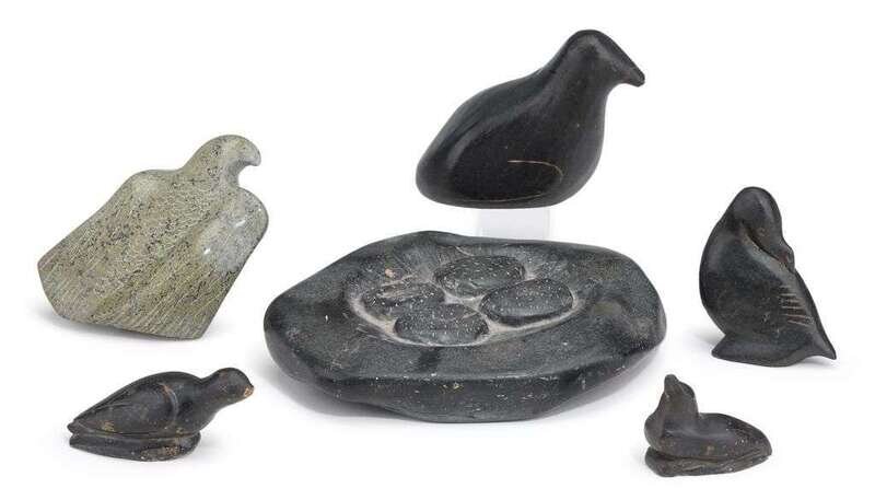 Including a nest with eggs and five carvings of birds in various positions, all signed/numbered, the eagle retains "Canada Eskimo Art" sticker.
