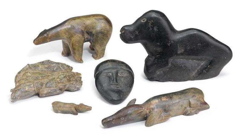 Group of six Inuit carved stone items canada and alaska, most 20th century
