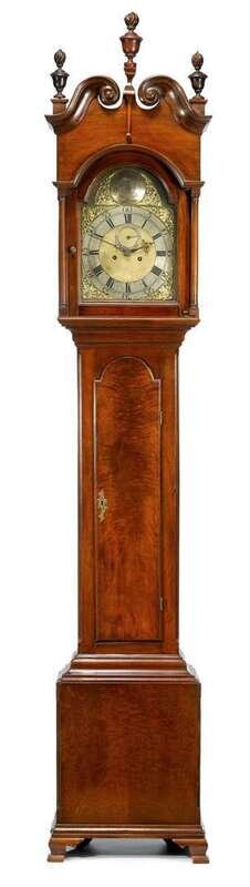 Double scroll cresting with scroll carved rosettes, three urn and flame carved finials, arched face door flanked by slender columnettes, brass face with circular boss above "Henry Taylor-Philadelphia," flanked by gilt dolphin and scroll spandrels, black enamel chapter ring with subsidiary seconds ring, corner gilt metal spandrels, outer minute ring in black enamel Arabic numerals, arched lip molded waist door flanked by thin quarter round corners, plain base with thin quarter round corners, on ogival bracket feet.