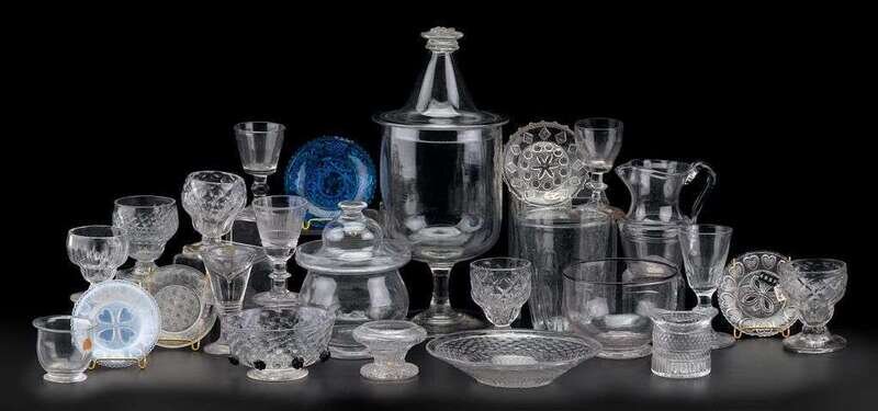 Including large covered footed urn, covered sugar, footed bowl, five salts, five wine glasses of various forms, low bowl with green prunts, hat, small plate and five pressed glass cup plates, one blue, one clambroth.