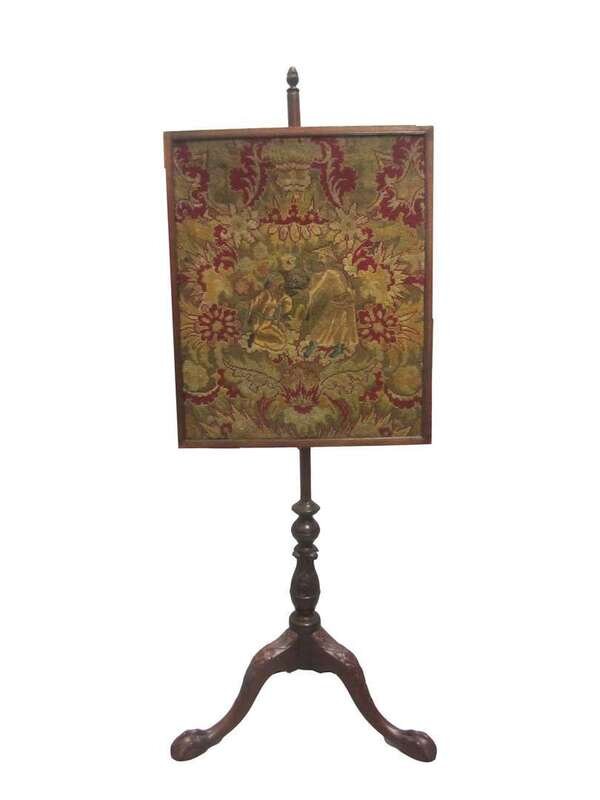 Rectangular frame holds silk and wool-worked panel on turned post, on belted ball and acanthus-carved and punch decorated baluster form support on carved cabriole legs ending in ball and claw feet.