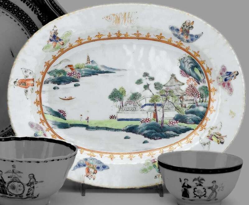 Chinese Export porcelain Famille Rose oval platter from the DeWitt Clinton Service circa 1796-1810