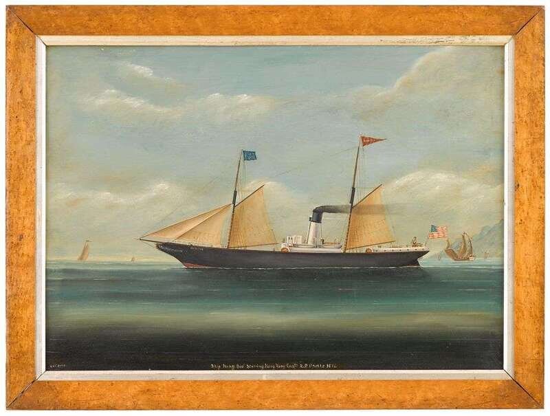 Signed lower left, "Lai Sung," entitled along lower edge, "Ship 'Hong Que' leaving Hong Kong Captn A.P. Preble 1876," oil on canvas, bird's-eye maple frame.