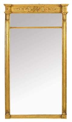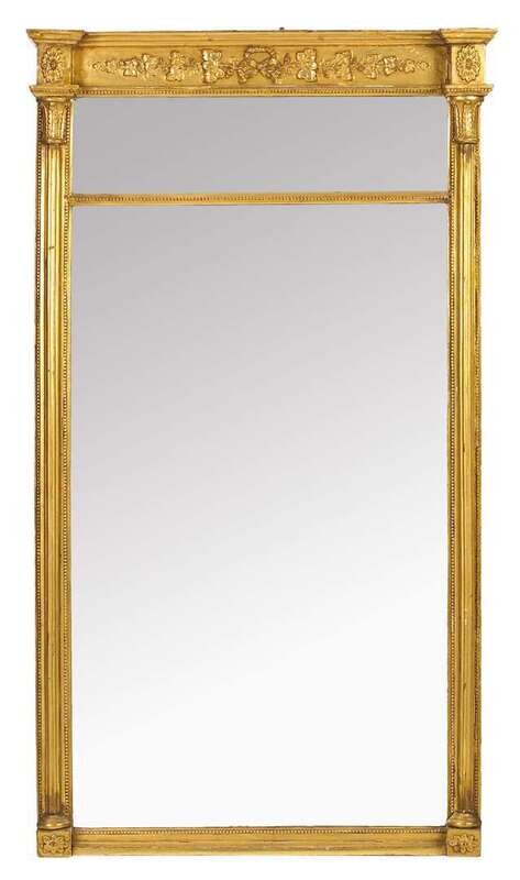Rectangular with inset panel decorated with leafy vine and center ribbon and oval floral rosettes, thin rectangular mirrored glass panel above a large mirror, flanked by reeded half columns with fern leaf-carved capitals and beaded borders, the base with corner rosettes.