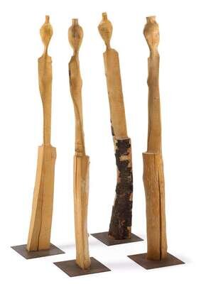Four sculptures of carved wood affixed to individual metal plates.