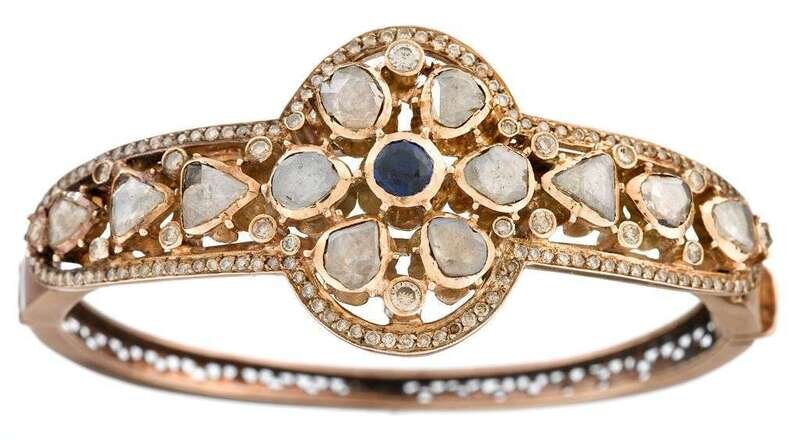A diamond, sapphire, and fourteen karat rose gold bangle