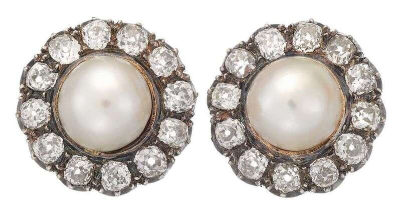 each set with a round white pearl, measuring approximately 11.00mm, within an old mine-cut diamond surround; total diamond weight approximately: 4.80 carats, with nine karat gold screw backs; accompanied by S.J. Phillips box.