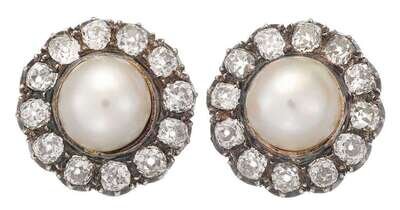 A pair of cultured pearl, diamond and silver-topped eighteen karat gold earrings 20th century