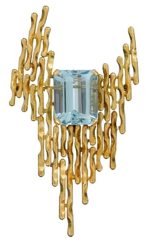 of abstract textured gold motif, centering a rectangular step-cut aquamarine; weighing approximately: 18.15 carats.