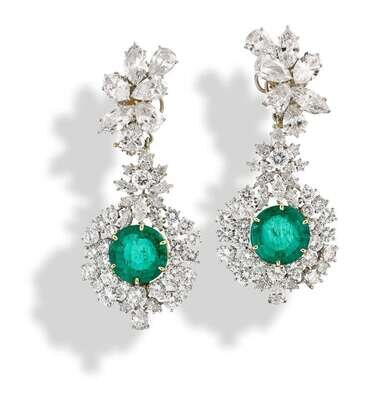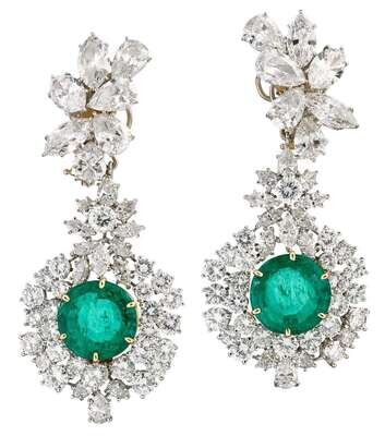 A pair of Colombian emerald, diamond, platinum and eighteen karat gold pendant earclips, Hammerman Brothers