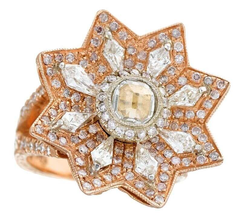 A diamond, colored diamond and eighteen karat rose gold ring