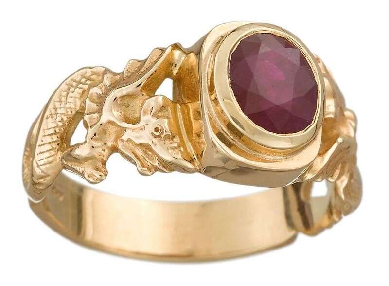 bezel-set oval brilliant-cut ruby; approximately: 1.55 carats; dragon motif shank.