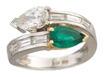designed as a by-pass motif of pear-cut emerald and diamond, accented by baguette-cut diamonds; pear-cut diamond weighing approximately: 1.00 carat, pear-cut emerald weighing approximately: 0.95 carat; remaining diamond weight approximately: 0.90 carat.