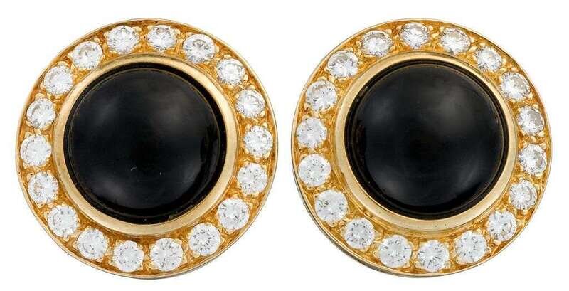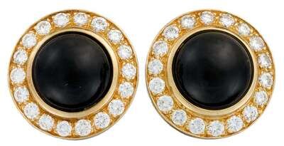 each centering a cabochon onyx, measuring approximately: 12.50mm, in a round brilliant-cut diamond surround; total diamond weight approximately: 2.00 carats.