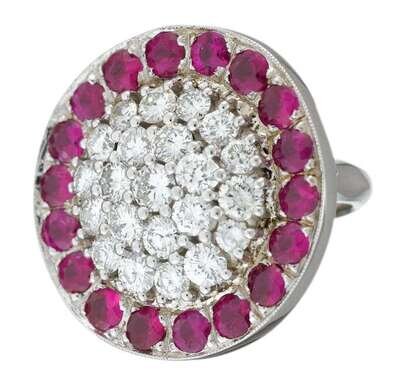 centering pavé-set round brilliant-cut diamonds surrounded by round-cut rubies; total diamond weight approximately: 2.00 carats.