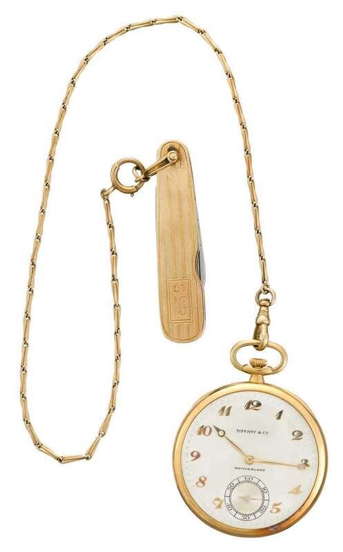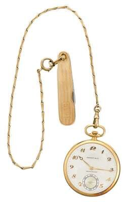 open face circular silver tone dial with Breguet numerals, signed Tiffany & Co., displaying subsidiary seconds dial; case numbered 804452; mechanical movement; numbered 804452, 18 jewel, 8 adj.; Swiss assay marks; accompanied by fourteen karat gold chain with gold cased utility knife, original box; case, dial and movement signed Tiffany & Co.; case and movement signed Patek Philippe.
