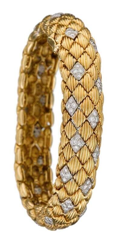 flexible link bracelet higlighting rhodium-plated sections, set with round brilliant-cut diamonds; total diamond weight approximately: 3.20 carats.