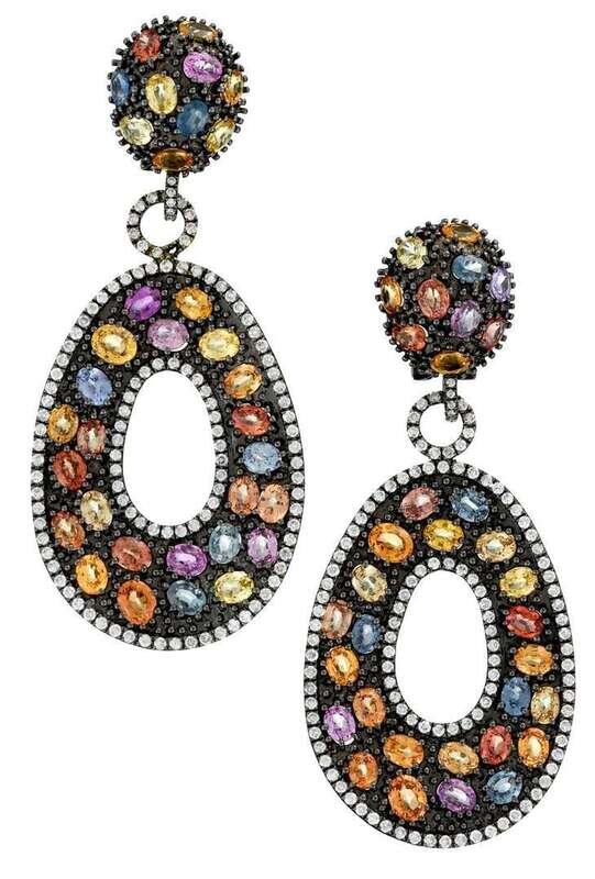 A pair of multi-color sapphire, diamond and black rhodium eighteen karat gold earrings