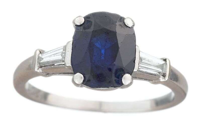 set with an old oval-cut sapphire, flanked by tapered baguette-cut diamonds; sapphire weighing approximately: 2.45 carats; signed J.E.C & Co., and numbered V 7580. (number slightly obscured).