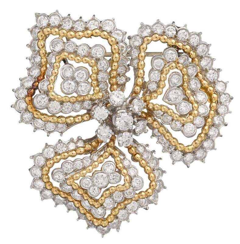 trefoil design set with round brilliant-cut diamonds; total diamond weight approximately: 5.00 carats.
