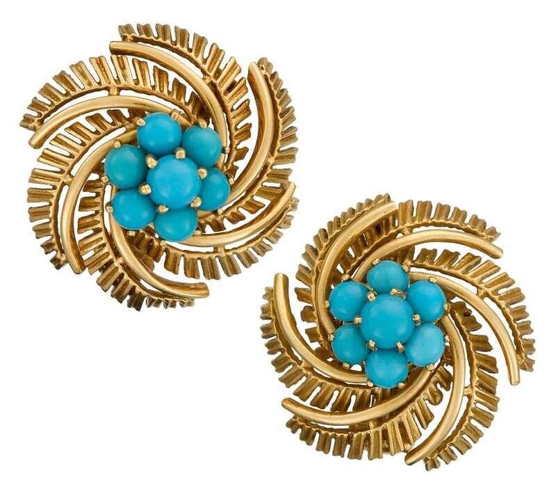 A pair of turquoise and eighteen karat gold earclips, Cartier Paris