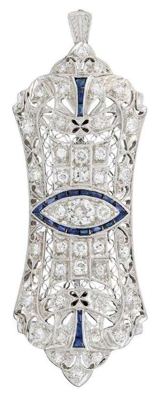 designed as a pierced plaque, centering a navette form with three old European-cut diamonds, accented by full and single-cut diamonds and synthetic French-cut sapphires; total diamond weight approximately: 1.00 carat.
