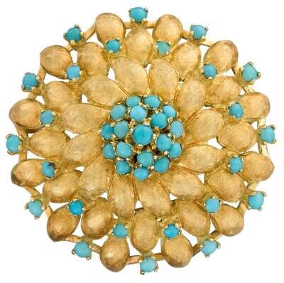 designed as a foliate motif with florentine finished gold accented by cabochon turquoise; Italian assay marks.