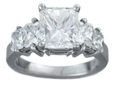 centering a radiant-cut diamond weighing approximately: 3.02 carats, flanked on both sides by radiant-cut diamonds; remaining diamond weight approximately: 1.50 carats.