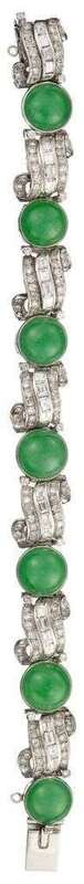 comprised of seven bezel-set jadeite cabochon links accented by baguette and round-cut diamond ribbon motif links; total diamond weight approximately: 4.75 carats.