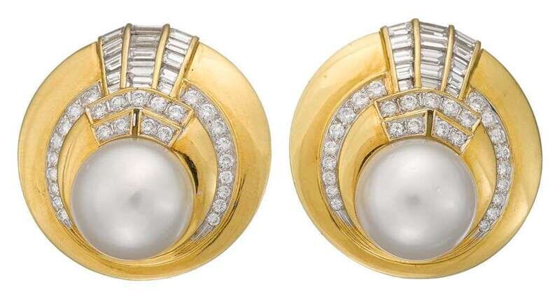 suite set with South Sea pearls measuring approximately 15.5 x 14mm to 14 x 12mm, accented by baguette and round brilliant-cut diamonds; total diamond weight approximately: 4.70 carats.
